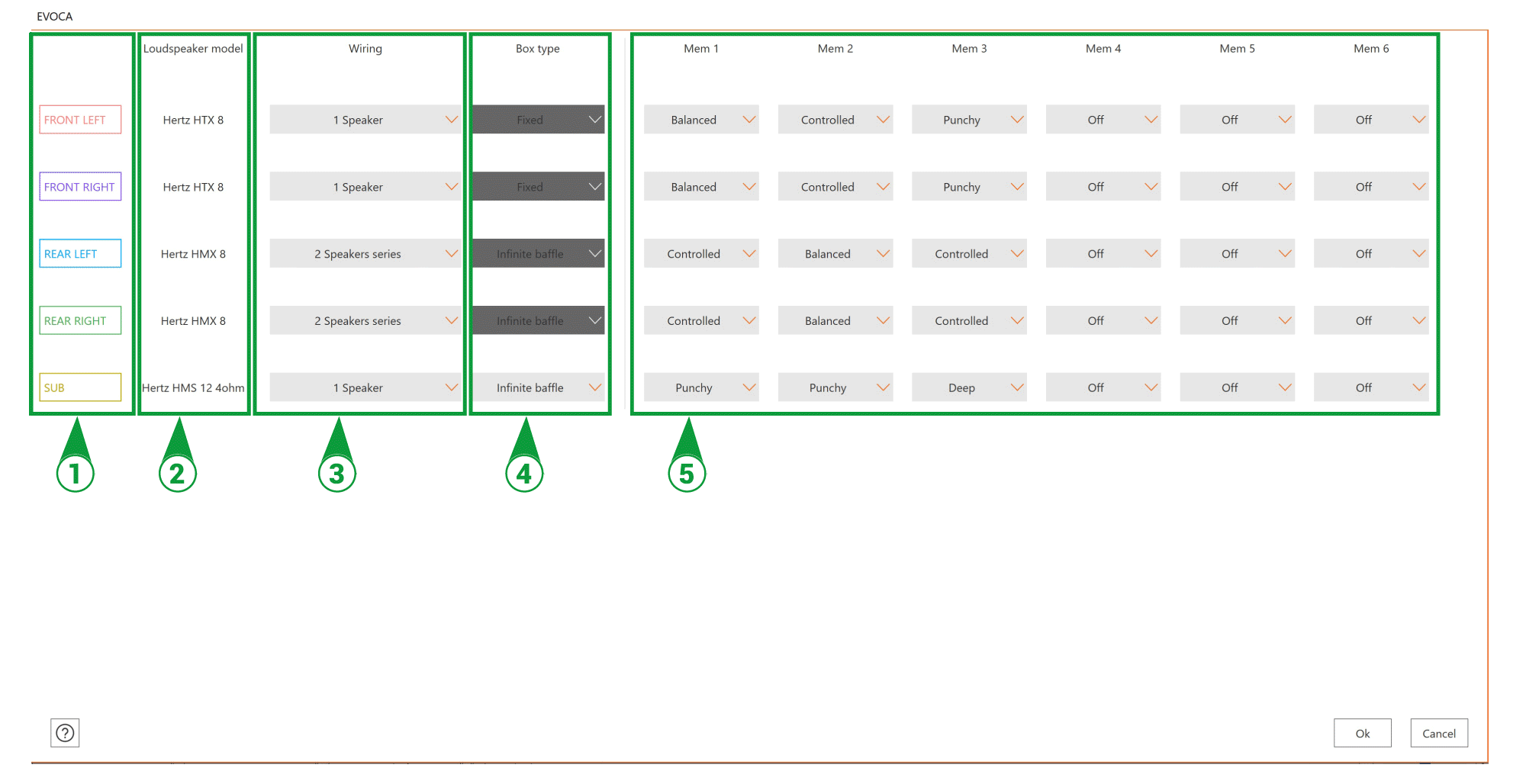 For each memory you can enable or disable EVOCA. When EVOCA is enabled, select the EVOCA preset from the dropdown list. Each EVOCA presets correspond to a specific set of EVOCA internal parameters.