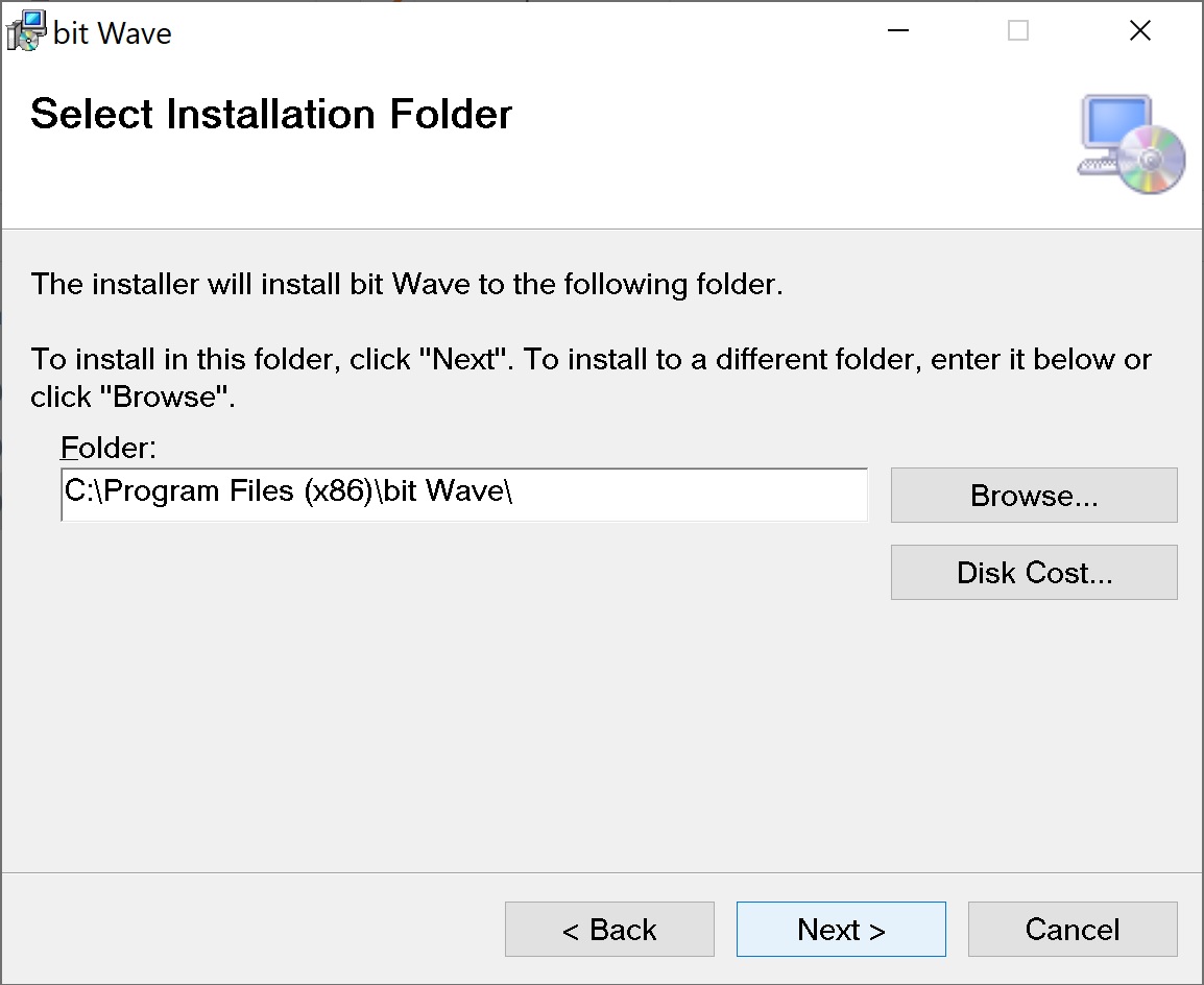 Press Browse if the user wants to change the bit Wave folder location in the PC, otherwise press Next to proceed.