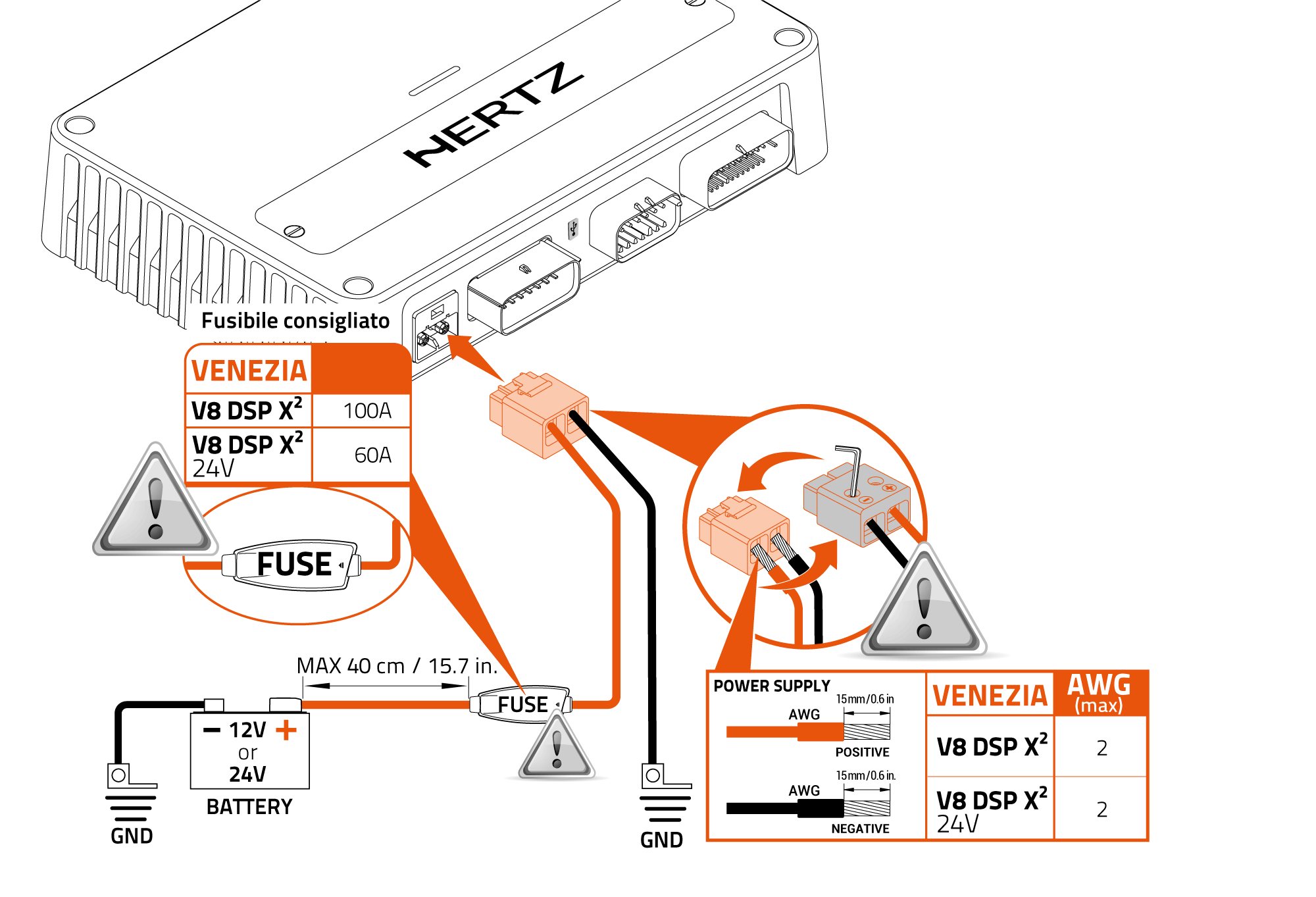 ATTENZIONE: È FONDAMENTALE INSTALLARE QUESTO AMPLIFICATORE IN MODO SICURO, EVITANDO DANNI ALL' IMBARCAZIONE. Un cablaggio errato dell’alimentazione può comportare danni all’imbarcazione, inclusi incendi. Si prega di attenersi scrupolosamente alle procedure di cablaggio corrette. Si raccomanda l’installazione da parte di un rivenditore autorizzato Hertz. |