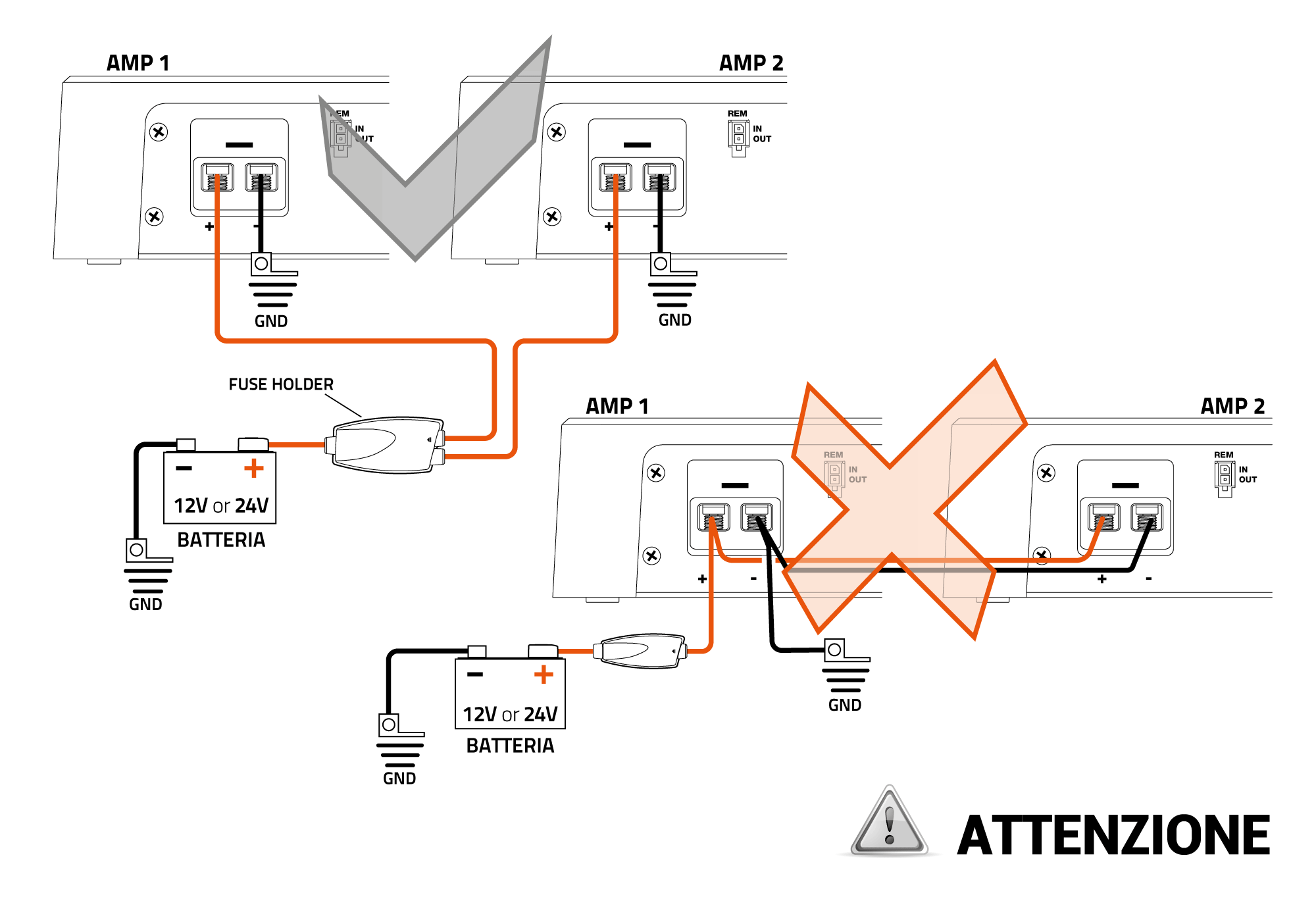■ La tensione di alimentazione non è idonea all’amplificatore eccedendo la propria soglia di sicurezza (esempio un amplificatore in versione 12V, è stato collegato ad un impianto 24V).